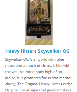 Heavy Hitters is the original high potency vape that gives smokers the best-tasting, most enjoyable high. With our proprietary blend of terpenes and our proprietary cannabinoid profile, our carts boast Cold-Filtered distillate for clean taste and potency. Bearing the Clean Cannabis Guarantee seal, Heavy Hitters proudly meets or exceeds all California standards for cannabis excellence and safety.